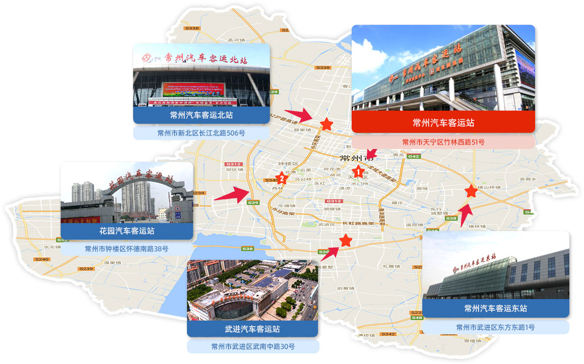 常州汽車客運站于2010年建成,地處常州北大門,是集高鐵、地鐵、公交為一體的綜合樞紐客運站。車站擁有11000平方米的候車、售票廳和32600平方米停車場,內設售票窗口5個,檢票窗口30個,是常州地區(qū)最大的公路客運站。